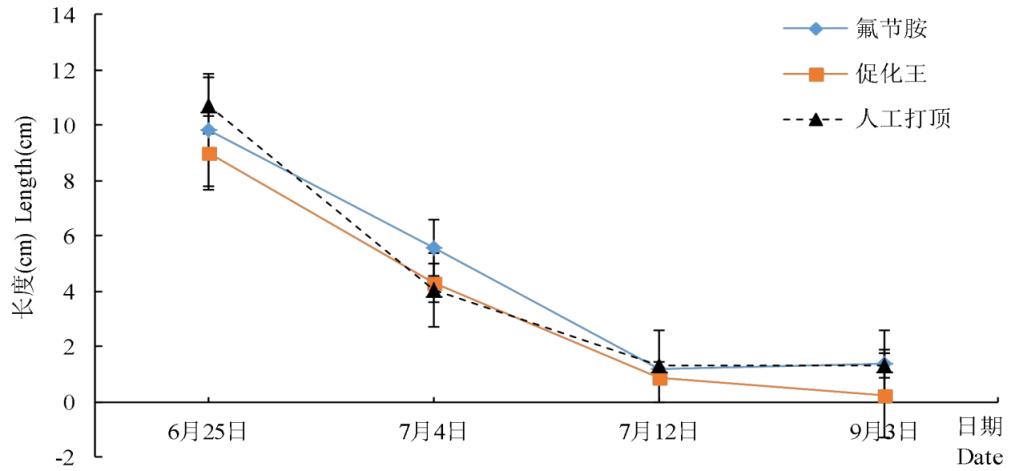 2020 年不同打顶处理下的主茎日增长量如图3-1、图3-2、图3-3,三个品种在各处理下的主茎增长量整体趋势相近,新陆中37号与新陆中82号喷施促化王打顶剂的棉株主茎到9月3日的增长量均小于喷施氟节胺处理下的棉株主茎增长量,新陆中70号品种在各测量日期下的主茎增长量均小于其他两品种。6月25日至7月4日新陆中37号主茎增长量大于其他两品种,7月4日至7月12日新陆中82号主茎增长量大于其他两品种,7月12日至9月3日三品种主茎增长量基本持平。