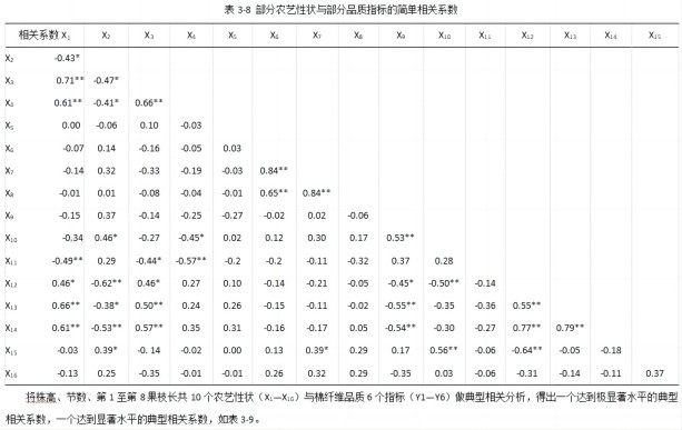 农艺性状与品质指标的相关系数如下表3-8。由表可知,在0.01水平下,株高(X1) 对整齐度(X13)呈显著正相关,株高(X1)与比强度(X14)呈显著正相关,第1果枝长(X3)对整齐度(X13)呈显著正相关,第1果枝长(X3)对比强度(X14)呈显著正相关,第8果枝长(X10)与伸长率(X15)呈显著正相关,上半部均长(X12)与整齐度(X13)呈显著正相关,上半部均长(X12)对比强度(X14)呈显著正相关,整齐度(X13)与比强度(X14)呈显著正相关;在0.01水平下,株高(X1)与马克隆值(X11)呈显著负相关,节数(X2)与上半部均长(X12)呈显著负相关,节数(X2)与对整齐度(X13)呈显著负相关,第2果枝(X4)与马克隆值(X11)呈显著负相关,第7果枝(X9)与整齐度(X13)、比强度(X14)均呈显著负相关,第8果枝长(X10)与上半部均长(X12)呈显著负相关。在0.05水平下,株高(X1)与上半部均长(X12)呈显著正相关,节数(X2)与伸长率(X15)呈显著正相关,第1果枝长(X3)与上半部均长(X12)呈显著正相关;在0.05水平下,节数(X2)与整齐度(X13)呈显著负相关,第1果枝长(X3)与马克隆值(X11)呈显著负相关,第7果枝(X9)与上半部均长(X12)呈显著负相关。