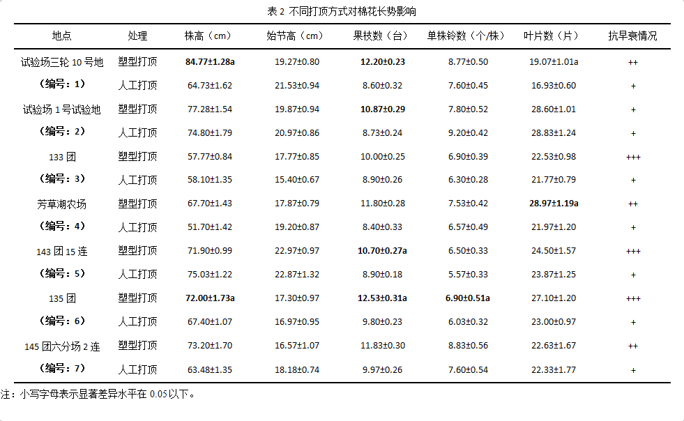 3.3 本试验旨在探究“塑型与打顶”对棉花生长发育、作用效果、对产量及品质的影响。对其进一步研究表明塑型和打顶技术既可以组合使用,也可以分开使用。在南疆布示范点时,大多数种植户不能接受药物打顶,我们调整方案,就采用塑型加人工打顶,也取得很好效果。在北疆有接近一半人可以接受药物打顶,我们给的方案时采用前期塑型后期药物打顶这种方案。目前市场上多数打顶技术有多种,有一遍的、二遍的、三遍的。在选择好打顶剂后,建议前期开展2-3遍塑型,把营养生长降下来,并快速转向生殖生长,再进行药物打顶成功几率增大很多。避免为保成功率,肆意加大药量,导致棉花受损,产量下降。