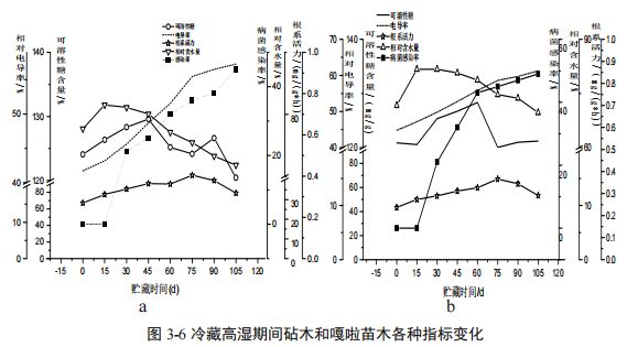 图3-6(a)显示低温高湿期间,苗木根系TTC含量呈现先增加后降低的趋势,在贮藏45d苗木活力达到最高值后逐渐下降,砧木苗木相对含水量在贮藏期间也呈现先升高后降低的趋势,由于贮藏环境湿度较大,到贮藏105d 苗木相对含水量整体没有减少。苗木可溶性固形物贮藏期间逐渐降低,到贮藏105d苗木可溶性糖含量甚至低于贮藏前苗木可溶性糖含量。值得注意的是贮藏期间苗木根系相对电导率和病菌感染率持续增加,两者之间相关性达到0.967,这可能是导致苗木后期根系TTC下降的原因。
